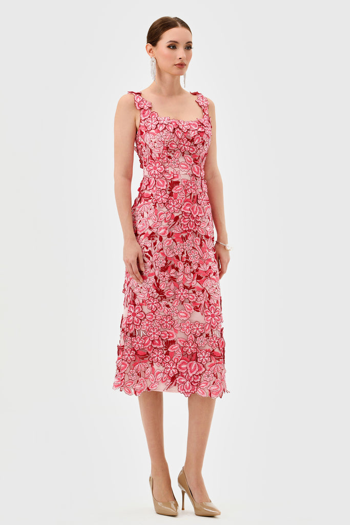 Our Bariano Jayde Square Neck Midi is a stunning pink floral lace with a square neckline and fitted silhouette. The design features three-dimensional floral embroidery in shades of pink and red, creating a richly textured and romantic effect. The wide shoulder straps are adorned with delicate floral appliqués that continue throughout the bodice and skirt. The hemline falls just below the knee, giving it a sophisticated yet feminine appeal. Perfect for weddings, garden parties, or elegant daytime events, this dress combines modern romance with classic elegance.
