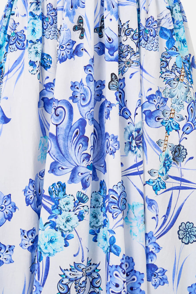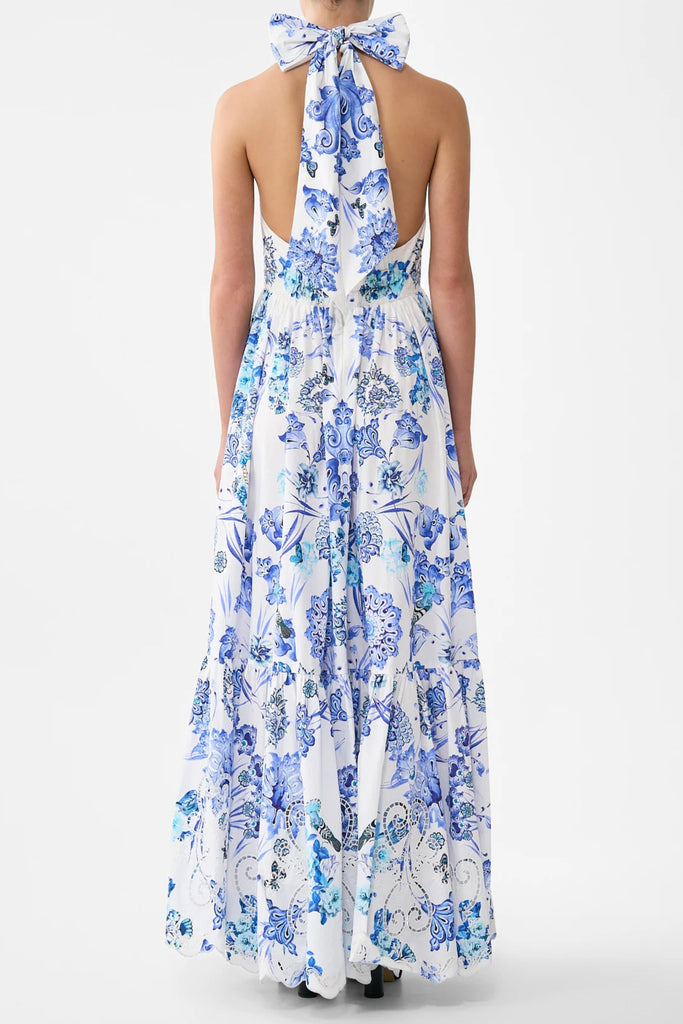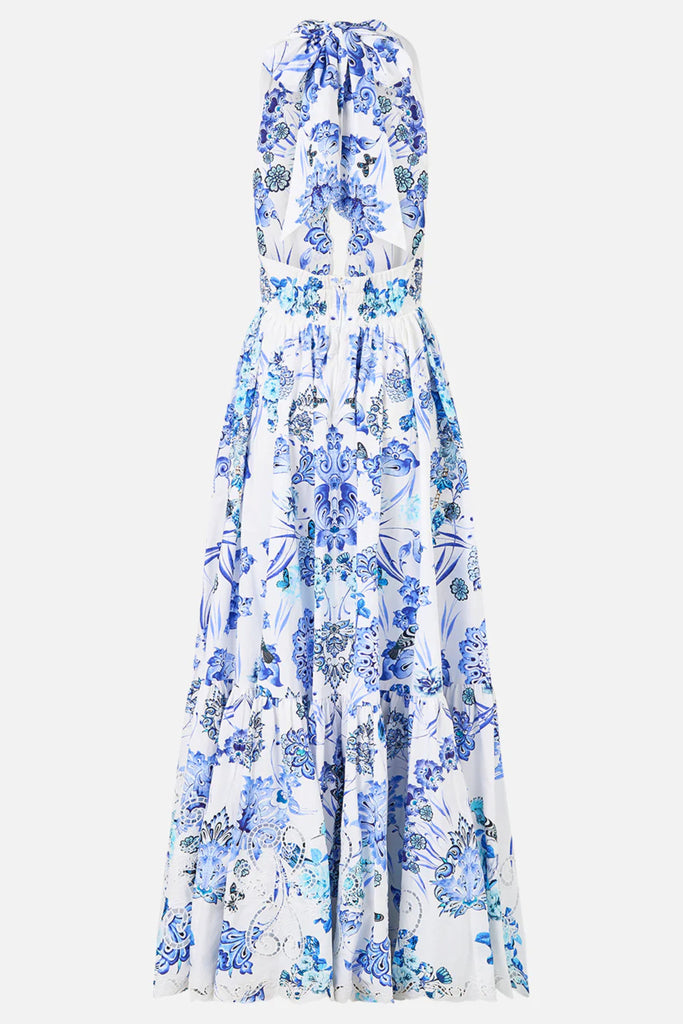 Our Camilla All About That Lace Ruffle Hem Halter Dress is handcrafted from 100% organic cotton in an exclusive limited edition print. A flattering halter dress featuring a full length skirt, completed with a fitted bodice and adjustable halter neck ties. With crystal embellishments along the plunging V neckline. A summer wardrobe staple.