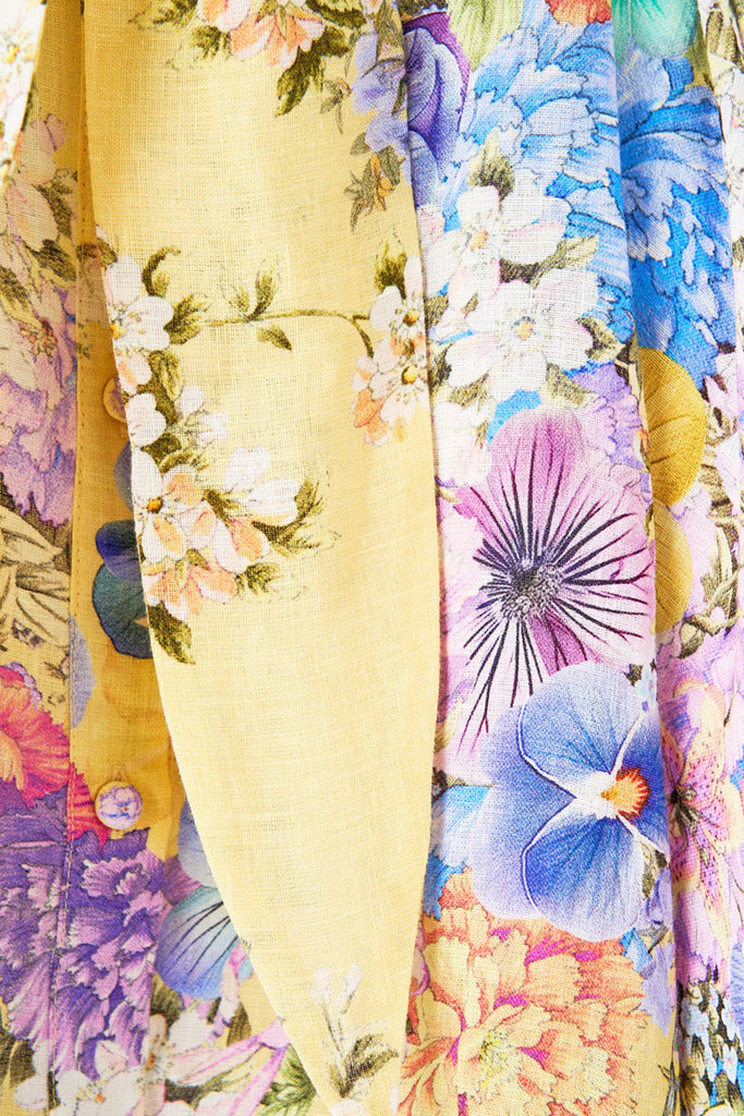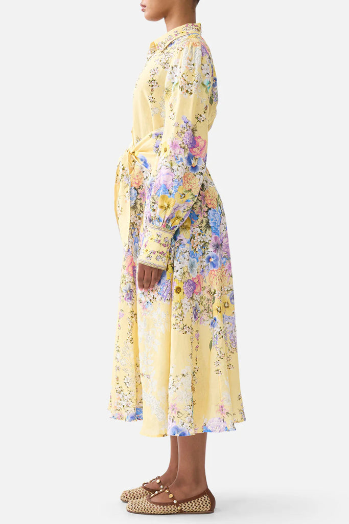 Our Camilla Darling Buds Waist Tie Shirt Dress is a handcrafted linen silhouette designed by in house artisans. Lovingly handcrafted an exclusive limited edition print, our shirt dress features a button through front and shirred back panel for effortless wear. This dress is the perfect blend of feminine practicality It's elevated and finished with a collar and adjustable front tie details.