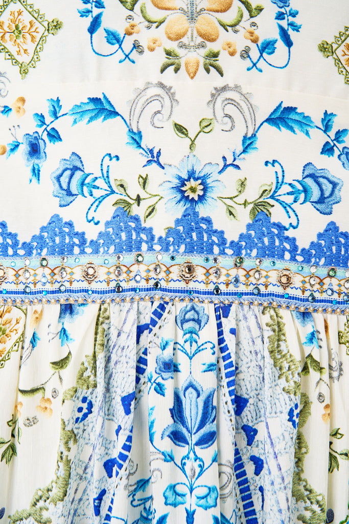 The My Homespun Heart Tie Shoulder Dress is a handcrafted silhouette designed by our Camilla's in house artisans. Reimagined in an exclusive limited edition print, this maxi dress is framed by a V neckline that is adorned with adjustable shoulder ties. The fitted bodice meets a curved yoke panelled skirt and gathers at the dropped waist into a full length hemline. It's finished with an Invisible zip alongside of the body for a comfortable, flattering fit.