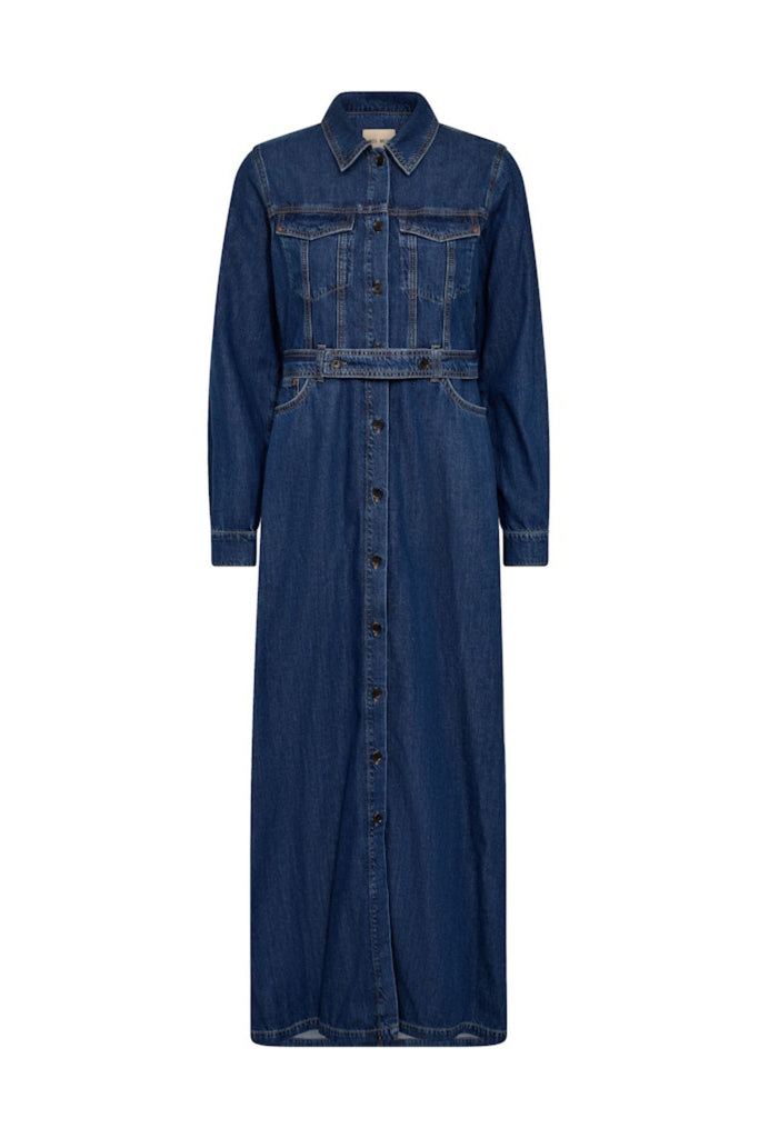 The Allaba denim dress is a timeless, effortlessly chic piece with a modern utilitarian edge. This dress blends classic denim jacket elements with the elegance of a full-length silhouette. The belted waist enhances shape, while the maxi length keeps it sophisticated and versatile. It can be styled casually with sneakers or boots, or dressed up with heeled ankle boots and statement accessories for a polished, contemporary outfit.