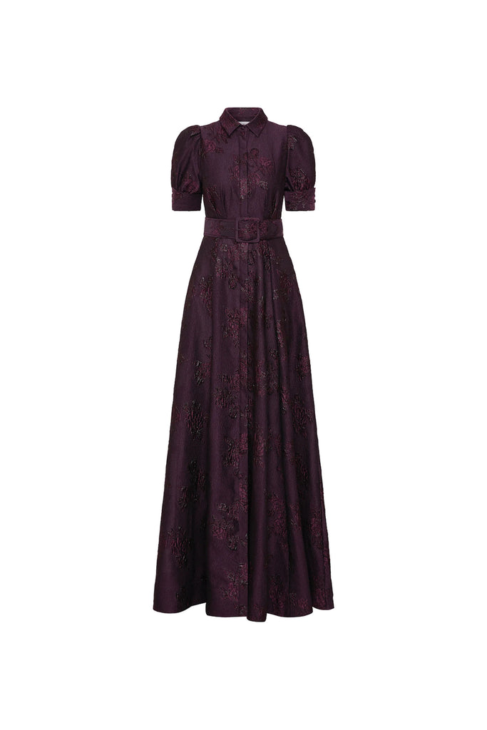 Our Stunning Rebecca Vallance Afina Short Sleeve Gown captivates in blackberry, crafted from metallic brocade. Featuring a sharp collared neckline and short puff sleeves with cuffs, it blends timeless elegance with modern flair. A self-belt cinches the waist, while the voluminous circular skirt creates a flattering silhouette. Functioning side pockets add a practical touch. Complete with lining and a removable slip dress with adjustable straps, it’s a versatile piece able to wear to many occasions.