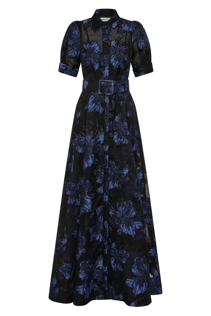 Our Stunning Rebecca Vallance Alexandra Gown captivates in striking blue hues on black, crafted from metallic brocade. Featuring a sharp collared neckline and short puff sleeves with cuffs, it blends timeless elegance with modern flair. A self-belt cinches the waist, while the voluminous circular skirt creates a flattering silhouette. Functioning side pockets add a practical touch. Complete with lining and a removable slip dress with adjustable straps, it’s a versatile piece able to wear to many occasions.