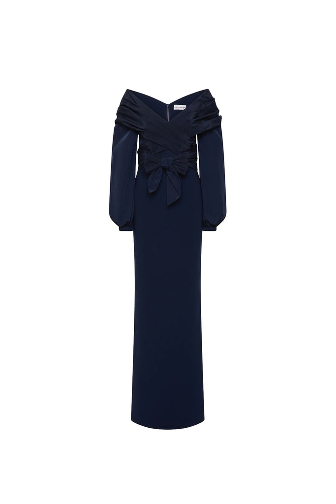Our Rebecca Vallance Sibylla Gown in Navy infuses sophisticated style and contemporary elegance. This gorgeous gown features an off the shoulder neckline and voluminous long sleeves with elastic cuffs seamlessly blend with the wrap bodice. The column maxi skirt shapes an elegant silhouette, enhanced with lining and a back split for comfort. Finished off by a versatile self-tie to highlight your waist. This dress is both refined and polished turning heads at any event.