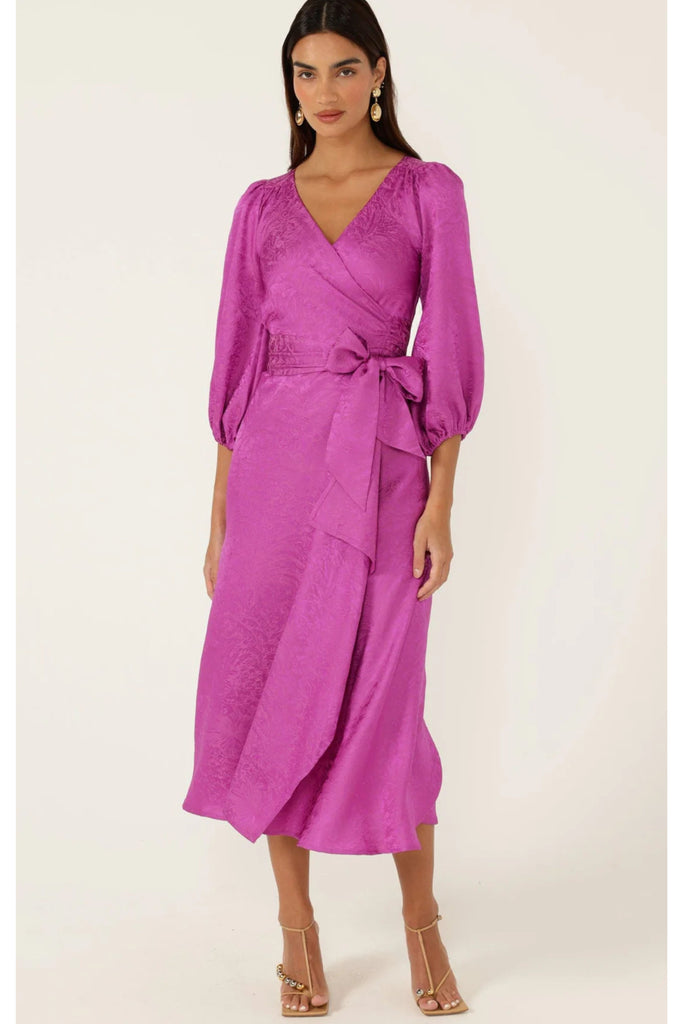 Stand out in our Sacha Drake Chateau Wrap Dress. The bold magenta is complimented by a subtle jacquard detail and the ever-flattering wrap dress shape. With mid length sleeves and a mid length cut, this dress will see you through season to season.