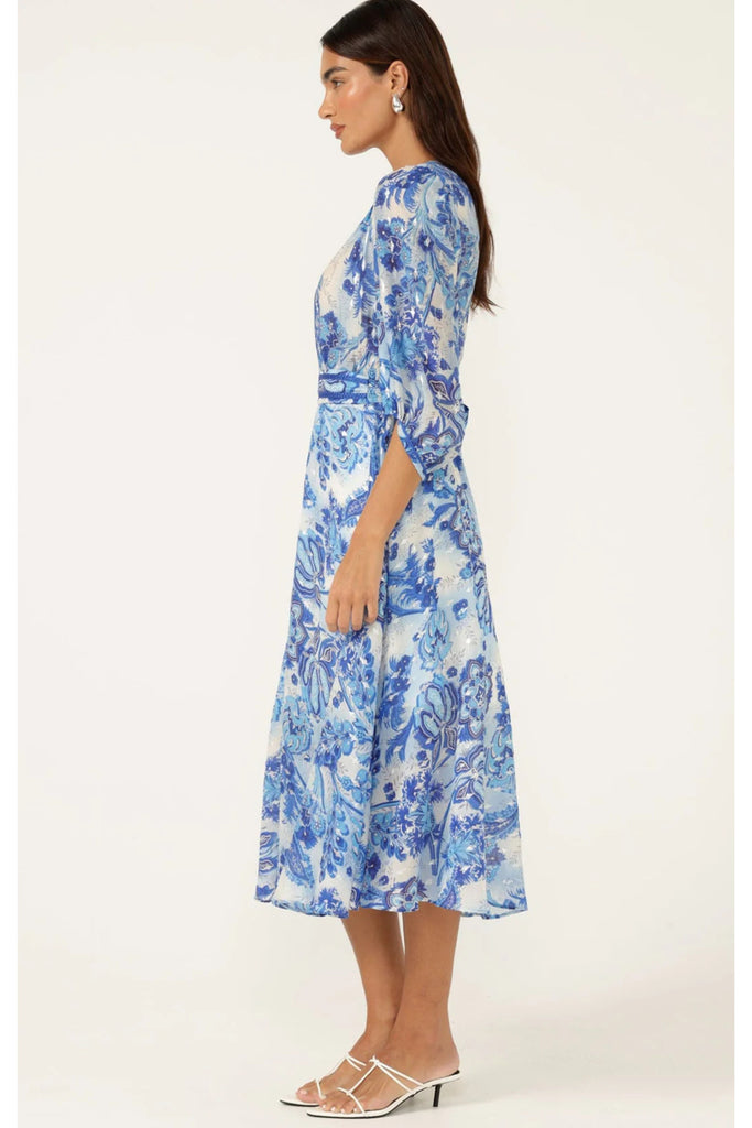 Our Sacha Drake Mykonos Midi Dress is designed in Australia and made from luxurious cotton with Silver metallic detailing, featuring a soft bloused sleeve, midi length, and detachable belt. The relaxed silhouette can be cinched with the detachable self-tie belt, making it a versatile choice for both elevated events and effortless everyday wear.
