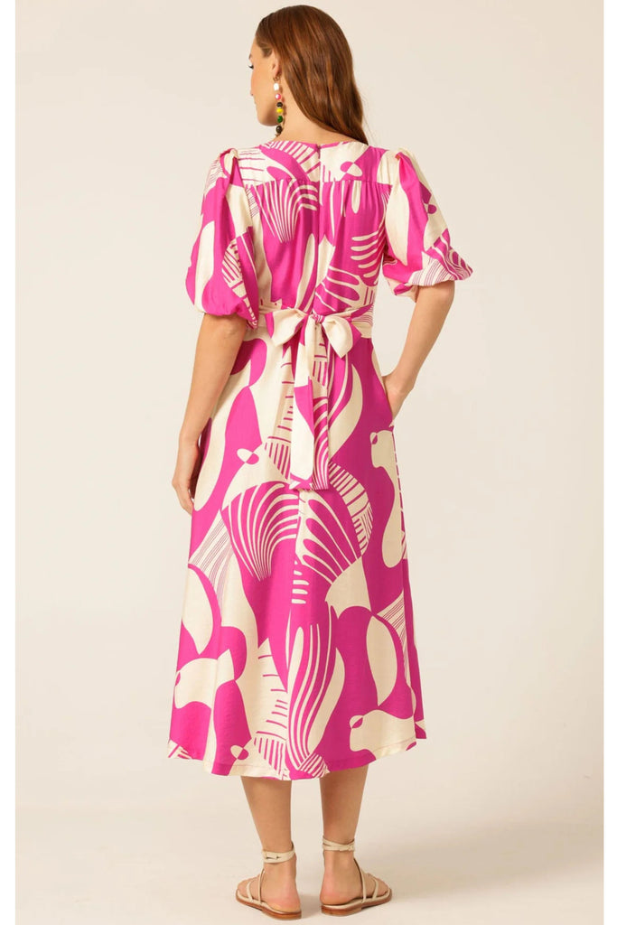 The ultimate little spring dress, our Sacha Drake Paloma Twist Dress is a lightweight sundress made from viscose. Featuring a front waist ties that can be twisted or wrapped around the body for versatile styling. With an A-line midi silhouette, and invisible back zip, bloused sleeves, elasticated cuffs, this piece is perfect for luncheons, races, and special events.