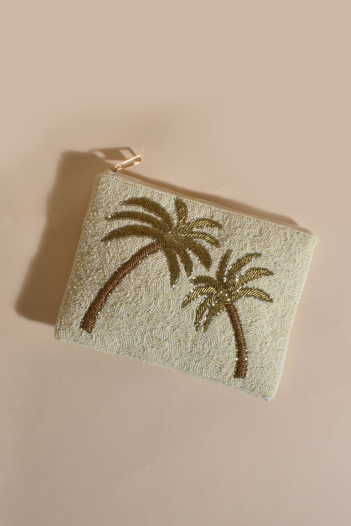 Beaded Palm Front Zip Top Clutch - White Gold