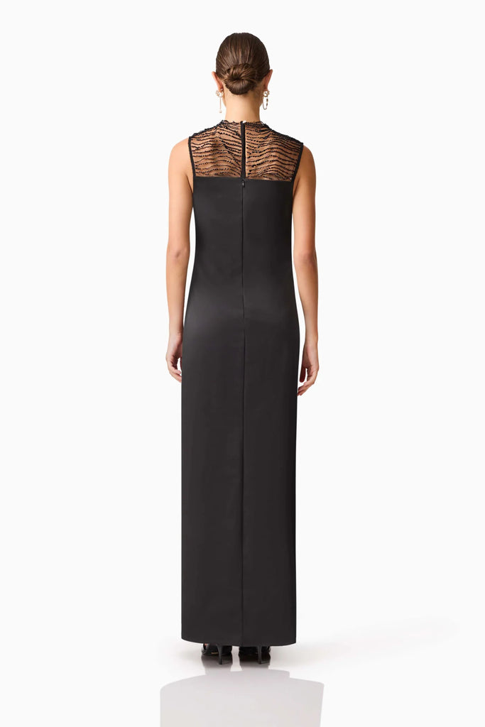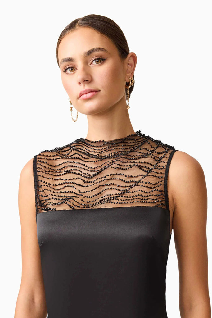 The Margot Satin Gown in Black is dramatic yet refined, crafted from luxurious satin and pearl-embellished mesh for a rich, sculpted finish. Featuring a structured high neckline, back keyhole detail, and slim fit silhouette, this gown creates a sleek, statuesque look. Finished with a centre back invisible zipper, it’s perfect for galas, receptions, and black-tie events.