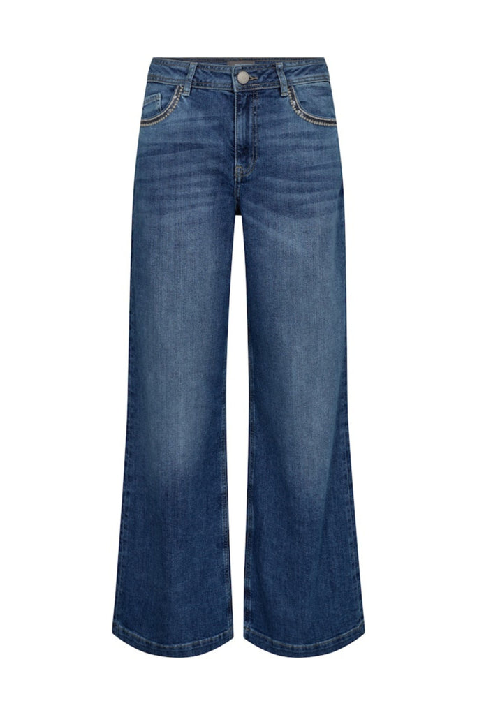 Our Mos Mosh Deco Jeans are cut with a wide leg and high rise for a flattering silhouette. The front pockets are adorned with elegant lurex and stitch details, adding a subtle yet stylish touch. They are designed to provide stretch and comfort while retaining their shape for years to come making them a versatile year-round staple. Finished in a mid blue wash, they exude a sophisticated look. Style them with a cosy knit for a casual look or a flowy feminine blouse for a more polished outfit.