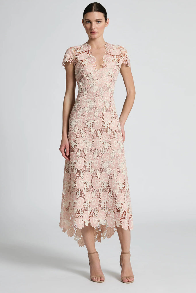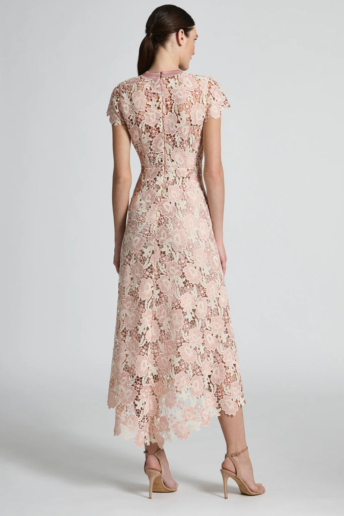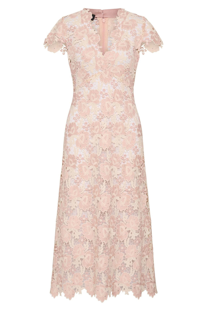 The distinctive elegance of our Moss and Spy Belinda Dress in two tone dusty pink and cream intricate guipure lace, adds a modern twist to the classic shift shape with delicate diamante detailing scattered throughout the embroidery. Featuring a flattering V-neckline, scalloped cap sleeves and soft A-line skirt, it’s ideal for weddings, formal luncheons and special daytime events. Comes with a matching satin slip.