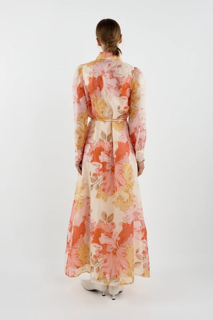 Our Sofia Irina Julie Maxi Shirt Dress is a classic yet contemporary shirt dress that will stand the test of time. Crafted from a silk linen blend, this button down shirting silhouette features long sleeves with buttoned cuffs, maxi length, a pointed collar, and a self tie tubular belt to accentuate the waist.